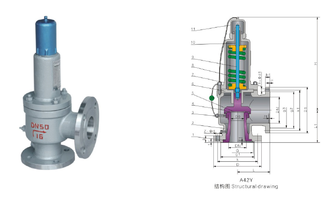 1.全啟式結構,排量大 2.閥瓣處設有反沖盤部件 3.平面結構的閥瓣和閥座易于維修和重新加工 4.整定壓力偏差小,可達±3% 5.選用優質的彈簧鋼,保證彈簧的壽命和穩定性
