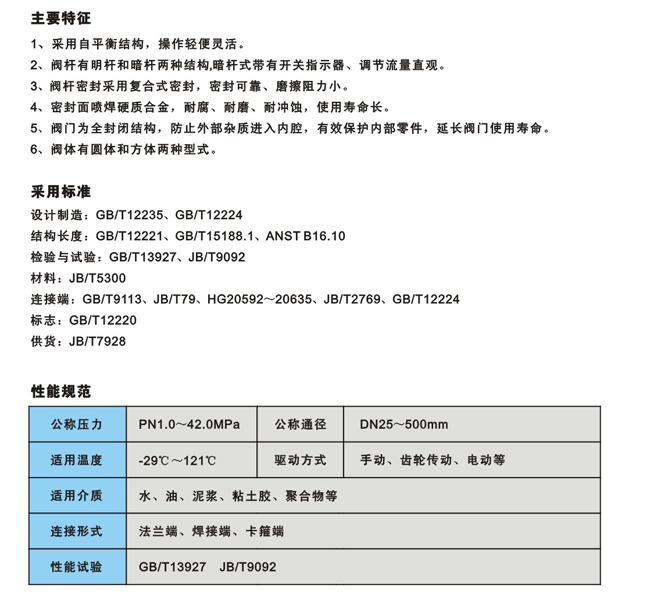 平衡式截止閥采用自平衡式、浮動密封座結構,其結構新穎、性能可靠。適用于工作壓力≥1.6MPa,工作溫度≤121℃的水、油、泥漿、聚合物、粘土膠、天然氣等管線上,借助流量計對介質流量實行精確調節,同時可作截止閥對管線起啟閉作用。